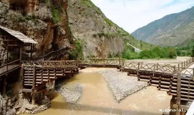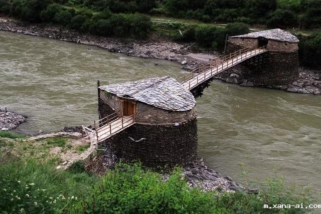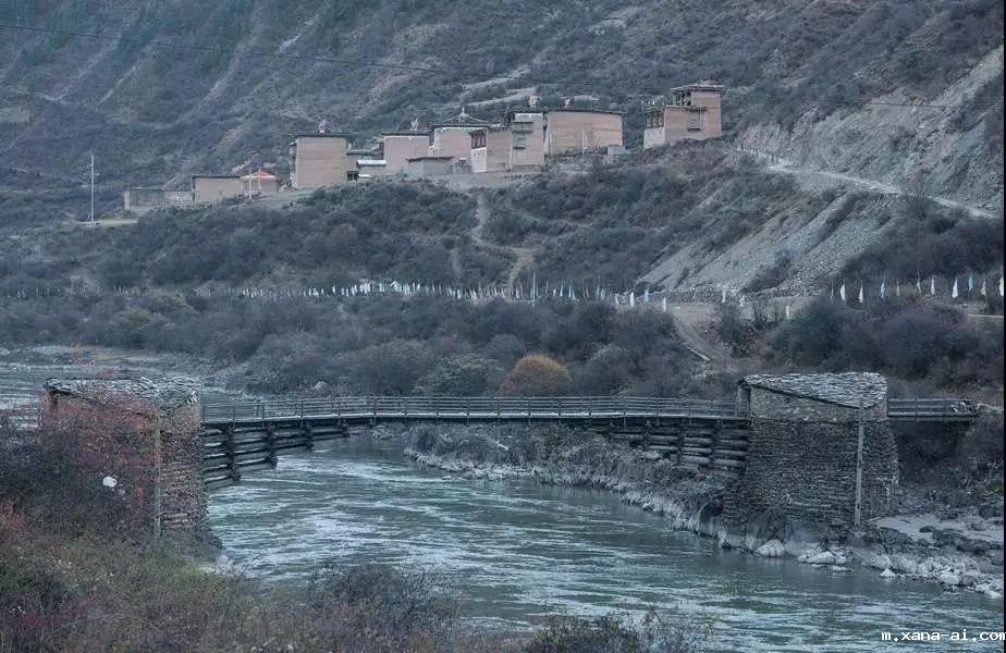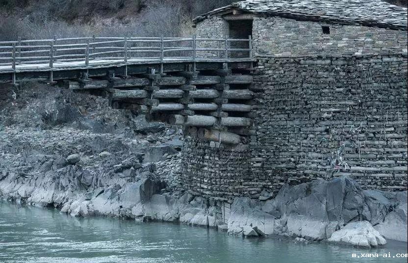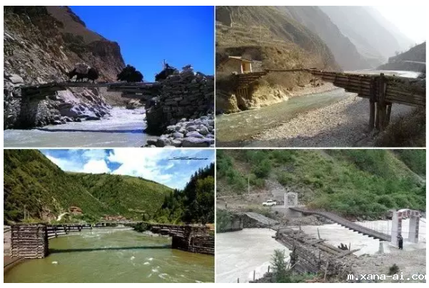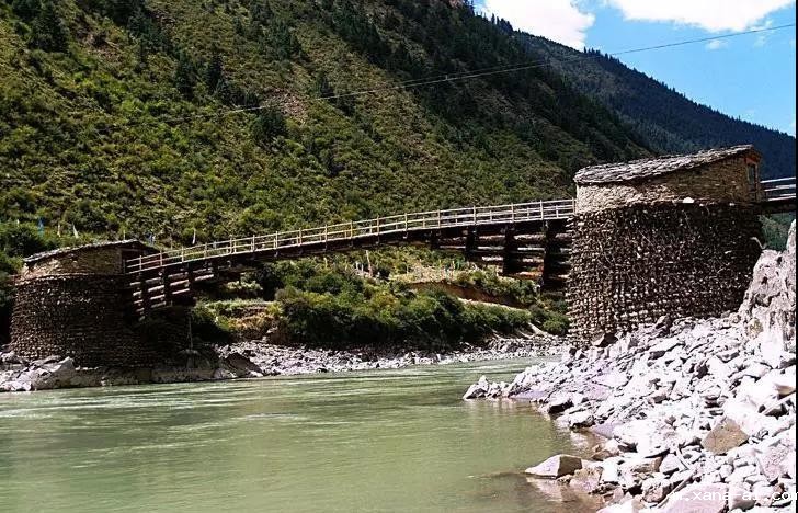 除西北地区以外,在西南藏区,现也保存有不少伸臂木梁桥。图4所示为四川阿坝、甘孜、凉山和西藏林芝等地的几座伸臂木梁桥。最为有名的,是在甘孜藏族自治州新龙县乐安乡境内横跨雅砻江的波日桥,见图5。这桥建于元末明初,1844年重建,1933年之后多次进行维修,是目前保存年代最久、跨度最大(主跨35.6m)的伸臂木梁桥。