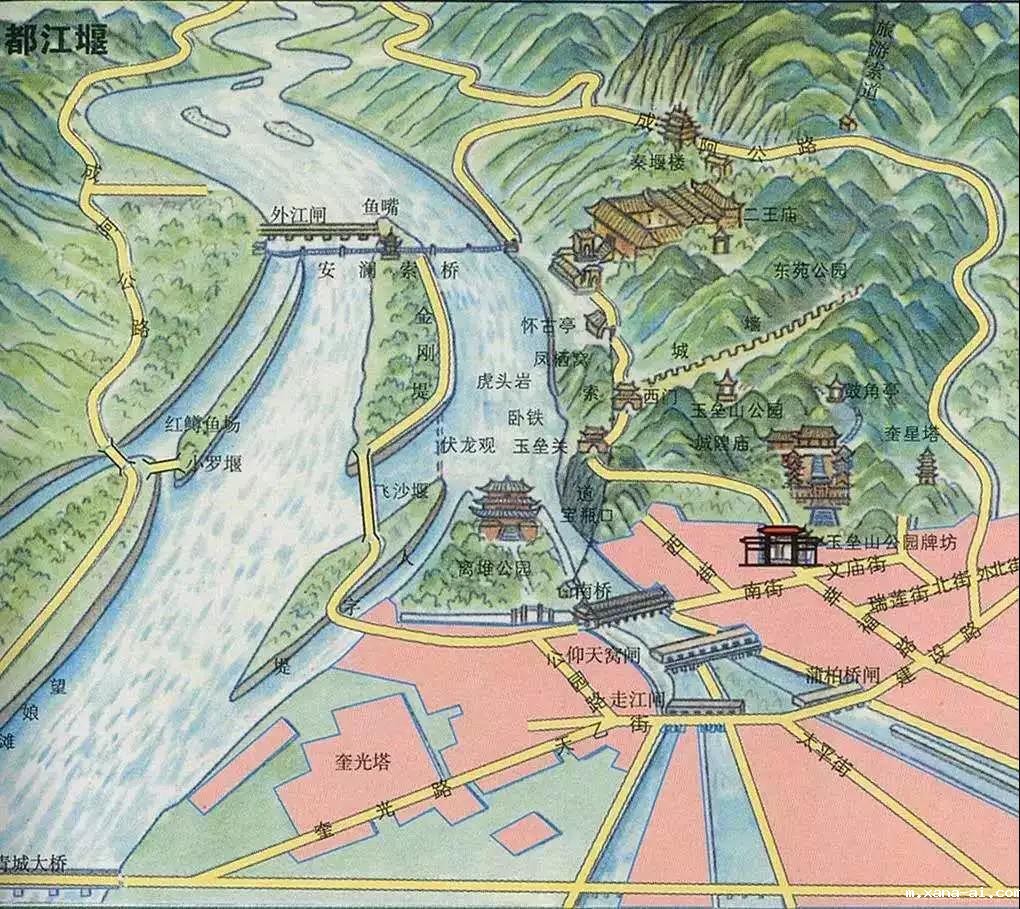 为了稳定内外两江的分流,岷江沙洲两岸,各筑起了石堤一道,名内外金刚堤。两堤在沙洲分水尖端相遇,形成沙洲的鱼嘴。内江经过宝瓶口的流量,具一定限度,过此限度,则超出的流量及所挟泥沙,在未到宝瓶口前,即从飞沙堰漫溢,而在沙洲尾流入岷江。通过各种控制设施,内外两江得到适度调节,防洪引水,保证了岷江的航运及灌溉功能。 自李冰创始,2000多年来,都江堰水利工程,逐渐改进, 到解放后,得到系统的更大的发展。