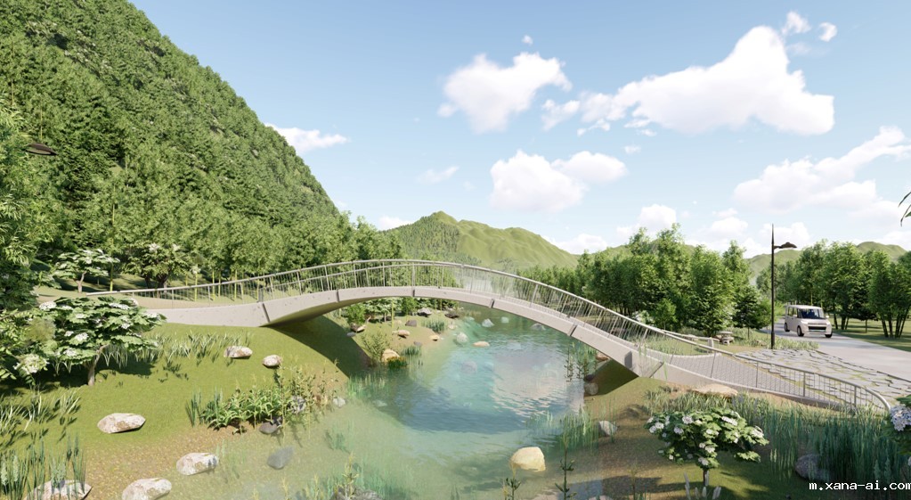 单跨实腹式现浇混凝土拱桥,以传统苗族建筑屋顶曲线为创意思路,整体造型简洁朴实,结构简单取材方便,施工难度不大。