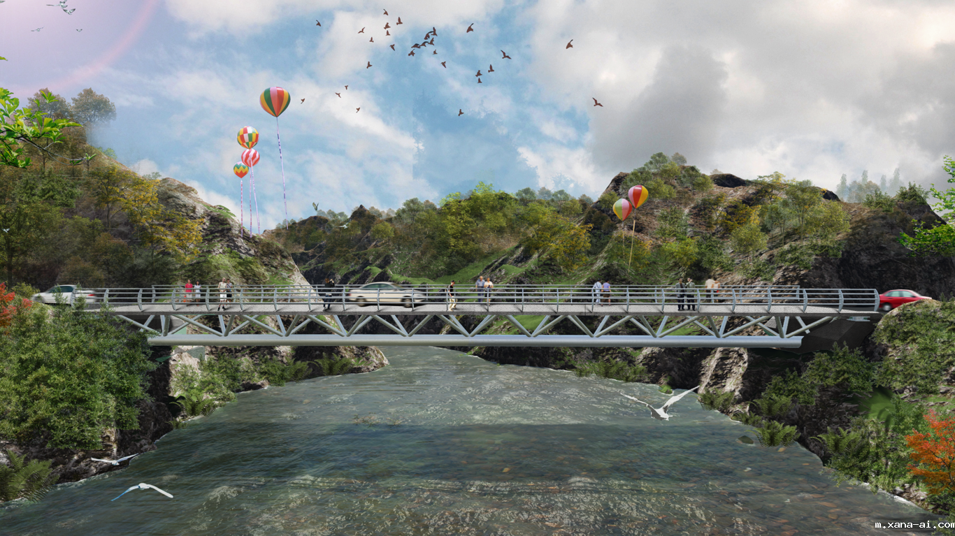 作品位于重庆市奉节县白帝镇大湾村,人行桥采用下承式钢管混凝土拱桥结构,全长35m,桥跨布置为2×17.5米,桥面宽7m。