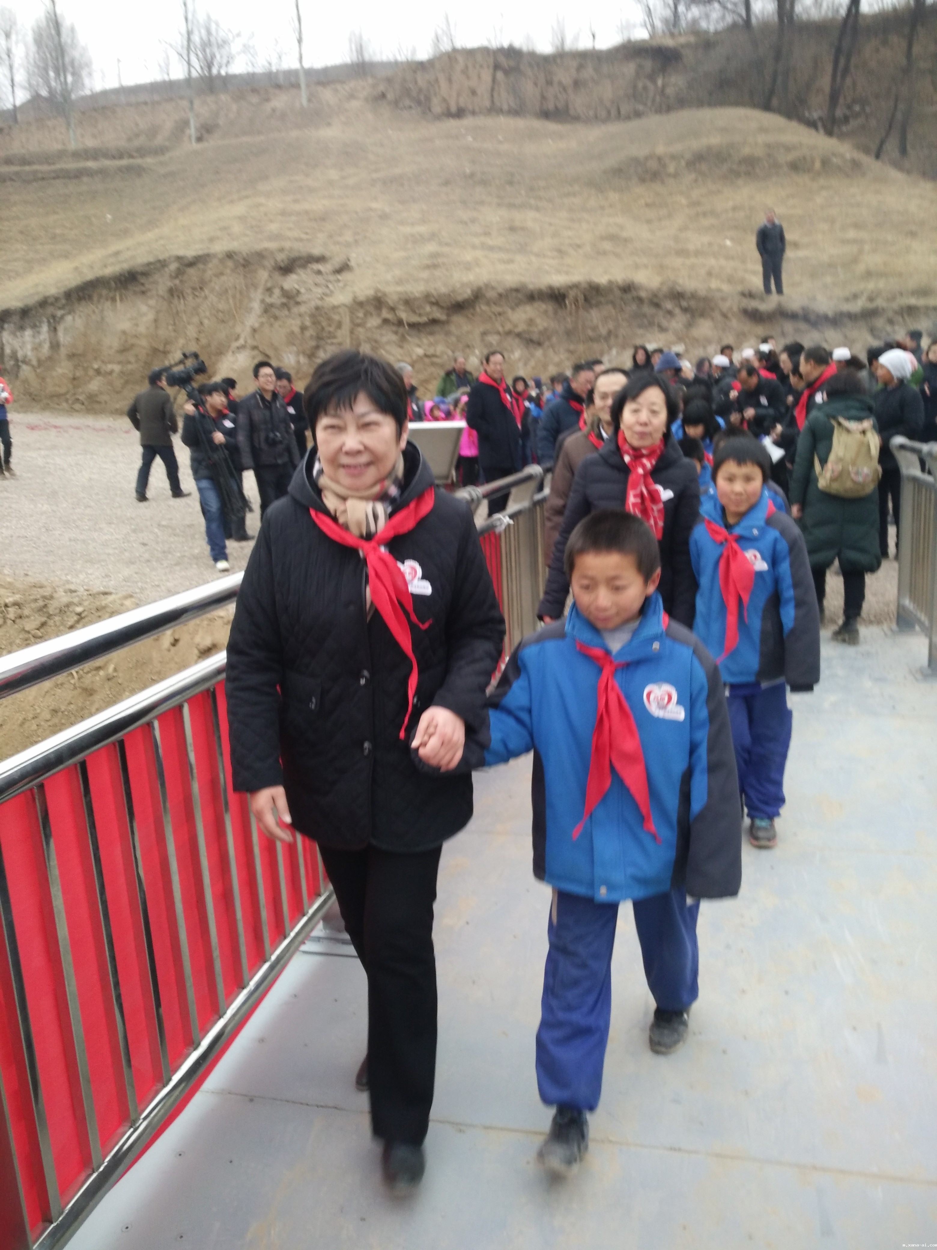 领导和孩子牵手走过泉湾儿桥