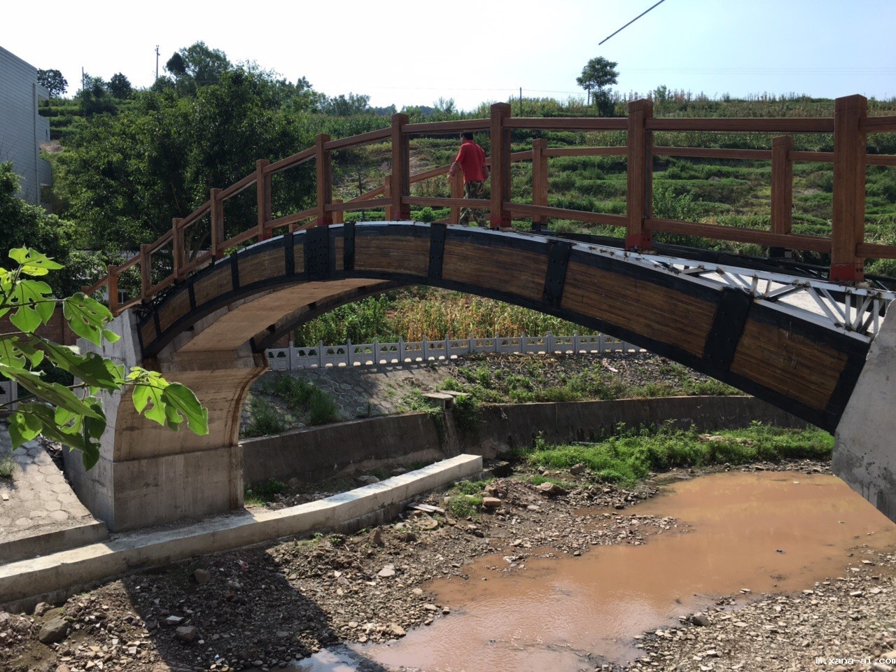 上部结构:微拱简支梁桥,跨中矢高0.38m,矢跨比1/32,由3根纵梁和5道横梁形成网格主梁,其上铺就混凝土和竹板。