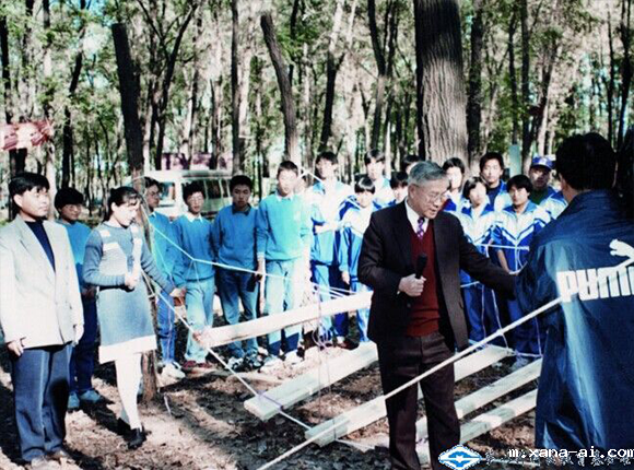 1996年11月,基金会与中央电视台“第二起跑线”栏目联合举办了“桥梁之旅”节目。图为北方交通大学校长、基金会常务委员万明坤给同学们讲解桥梁知识。